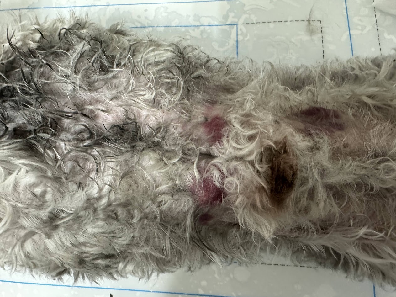 下腹部に紫斑が出てる子の写真になります。毛に埋もれて分かりにくい時もありますが、誰かに殴られたような跡が出てくることがあります。気づきにくいですが、重要な臨床症状のひとつです。